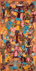 esplora le assonanze, i richiami interni che più o meno involontariamente attraversano il fare artistico di chi in Africa è nato e di chi l’ha eletta come propria patria creativa. Così accanto ai paesaggi umani di Lilanga, senza fondo e senza prospettiva (quasi a voler reinventare la pittura medievale) ecco i racconti per immagini di una Africa magica firmati da Bush Mikidadi. Accanto alle geometrie di linee e colori della celebre artista sudafricana Esther Mahlangu ecco le modernissime e sensibili pitture astratte su legno di Endgaget Legesse, talentuoso artista etiope nato nel 1971. E via di questo passo, in un mosaico di forme e colori che ci dice di nuove affascinanti tribù dell’arte, nomadi e imprendibili.