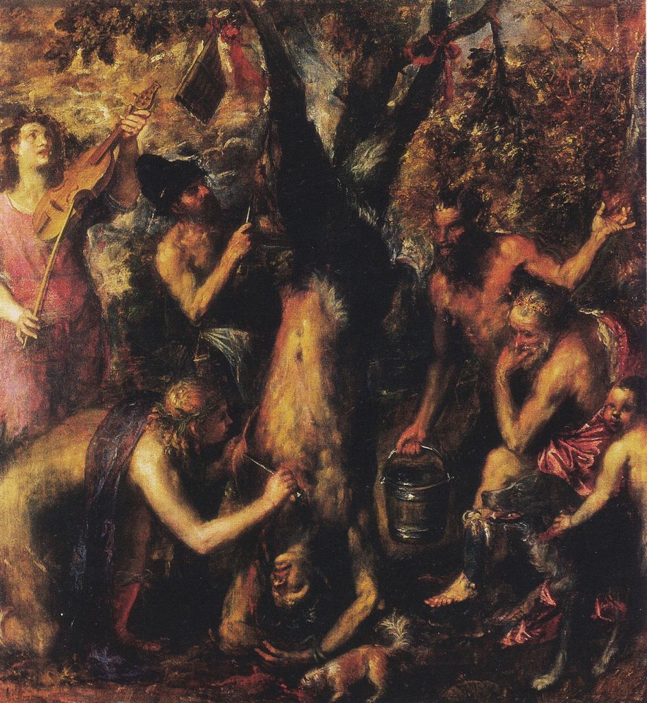 Come nel feroce Supplizio di Marsia (1570)conservato nel Castello ceco di Kromeriz in cui un sadico Apollo, con un coltellacci, scuoia un malcapitato Marzia, appeso a testa in giù, come condanna per aver osato sfidare la divinità nella musica. Su uno sfondo ribollente di rossi e di marroni, figure come arse da un fuoco paiono baluginare alla superficie della tela per poi svanire.
