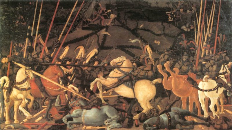 Una selva di lance spezzate e il bagliore delle armature. E poi il sangue, i soldati morti mentre i cavalli scalciano con vigore. Così rappresentava, con una prospettiva inedita e in scorci vertiginosi, la Battaglia di San Romano (1438-1440) il pittore Paolo Uccello.