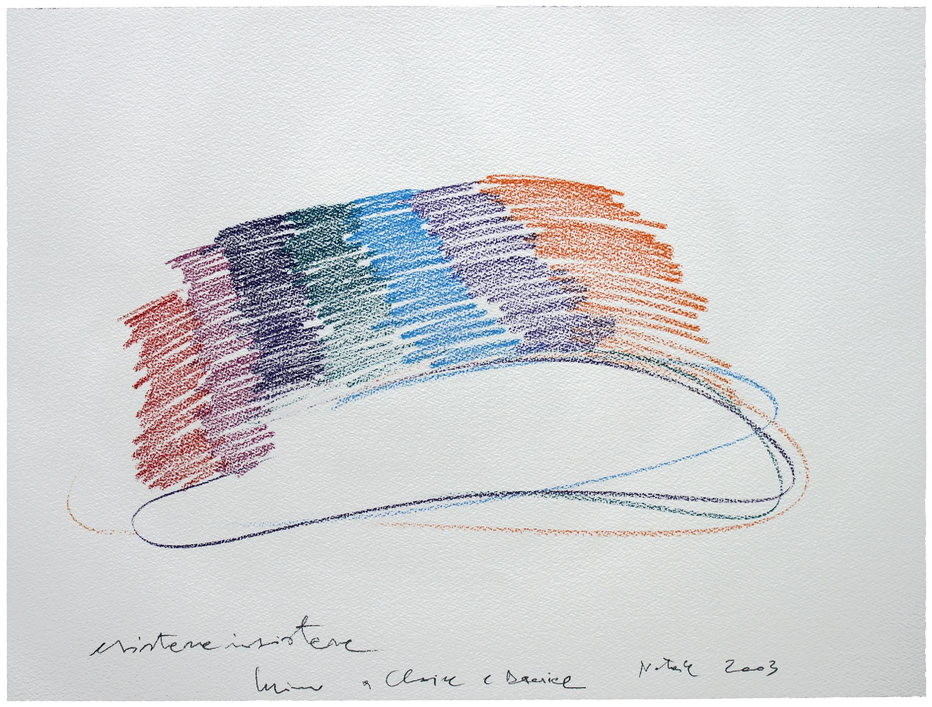 Disegno come dono, in senso stretto come regalo, omaggio d’amicizia, di affetto, di “corrispondenza di amorosi sensi”. Luciano Fabro usava ogni tipo di supporto per inviare i suoi appassionati messaggi colorati agli amici, ai suoi studenti, alle persone con cui aveva stabilito un rapporto profondo, anche se fuggevole.